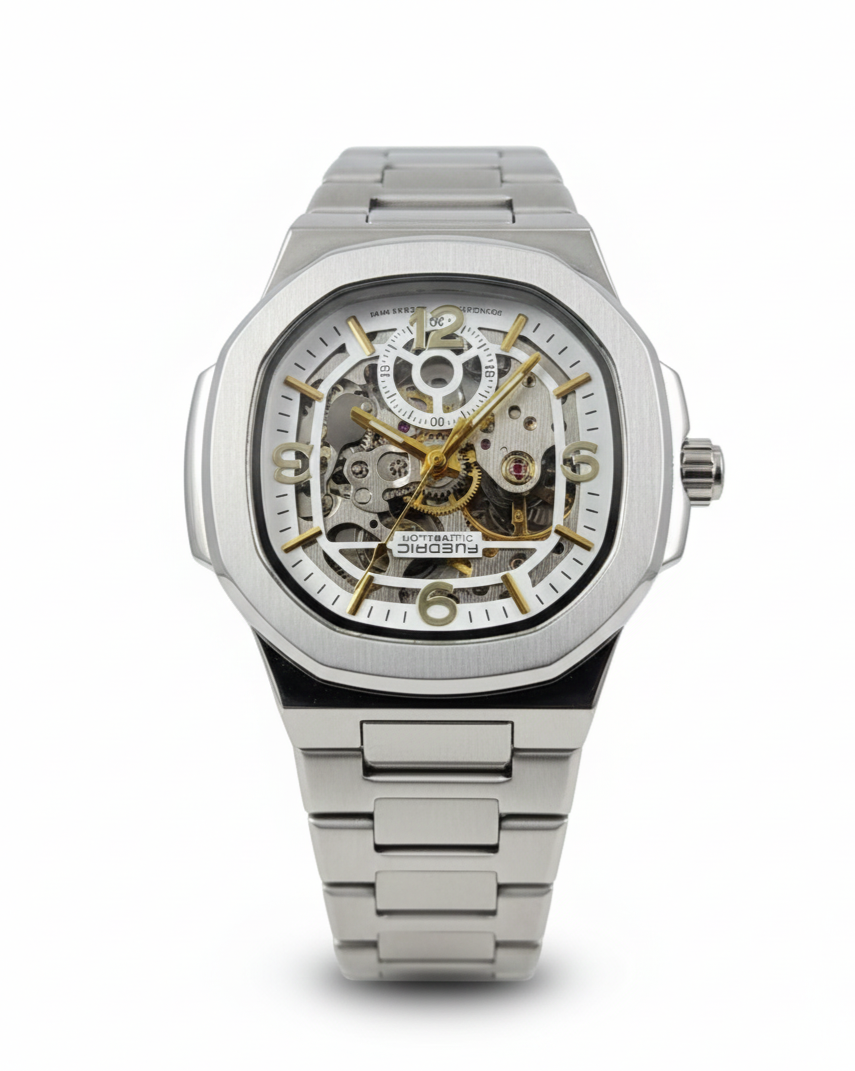 The watch features a mesmerizing open-heart skeleton dial that reveals the intricate automatic movement beneath. Every tick and turn of the golden gears, rotors, and balance wheel is proudly showcased, inviting admiration. The delicate yet bold gold-toned indices and hands stand out against the raw metallic beauty of the exposed movement, ensuring time remains legible. Encased in a distinctive angular stainless steel case with an integrated matching stainless steel bracelet, it boasts a modern, robust, and luxurious aesthetic.